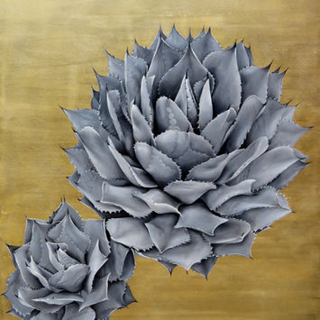 Nessa subsérie eu retrato espécies do gênero botânico Agave. O fundo da pintura é trabalhado com uma tinta à base de café e velatura dourada. Já as plantas são pintadas a óleo em preto e branco